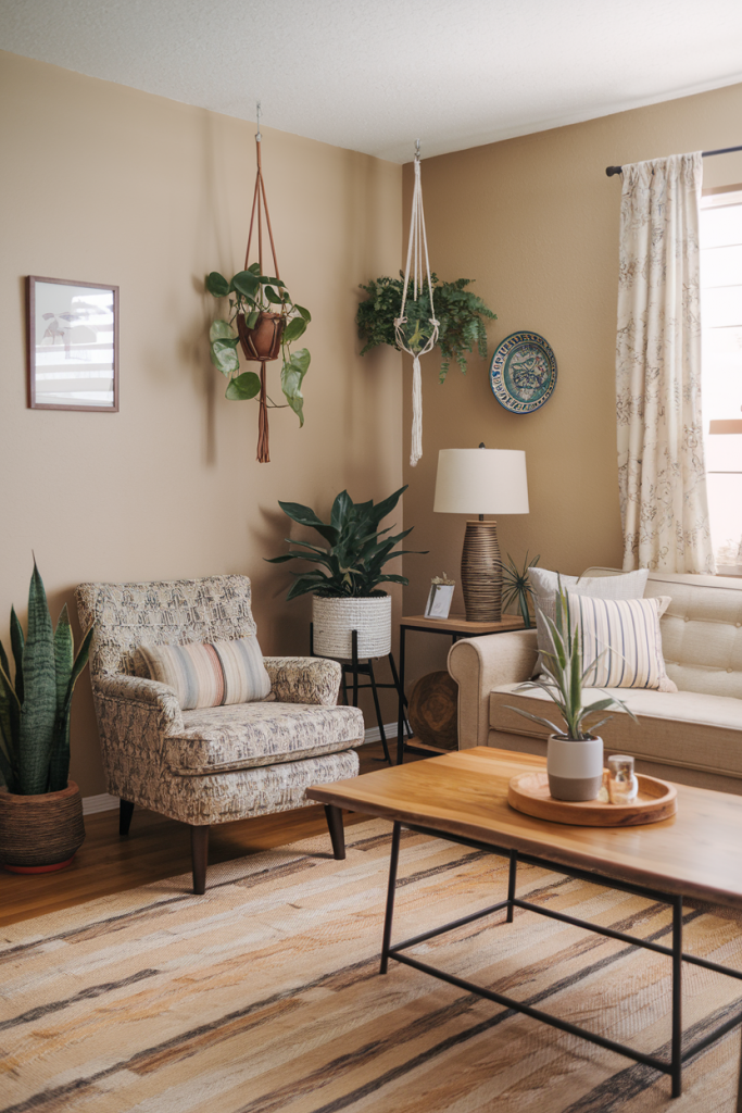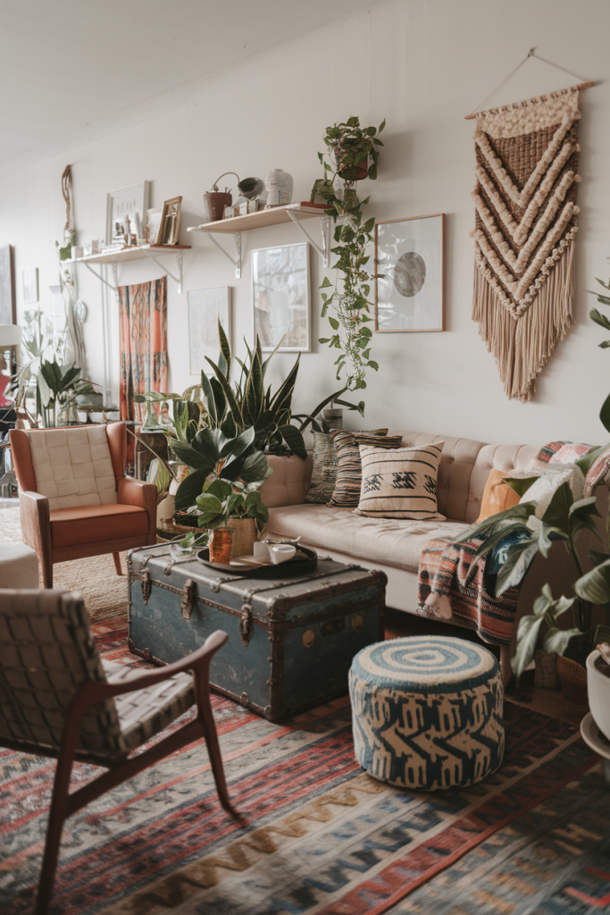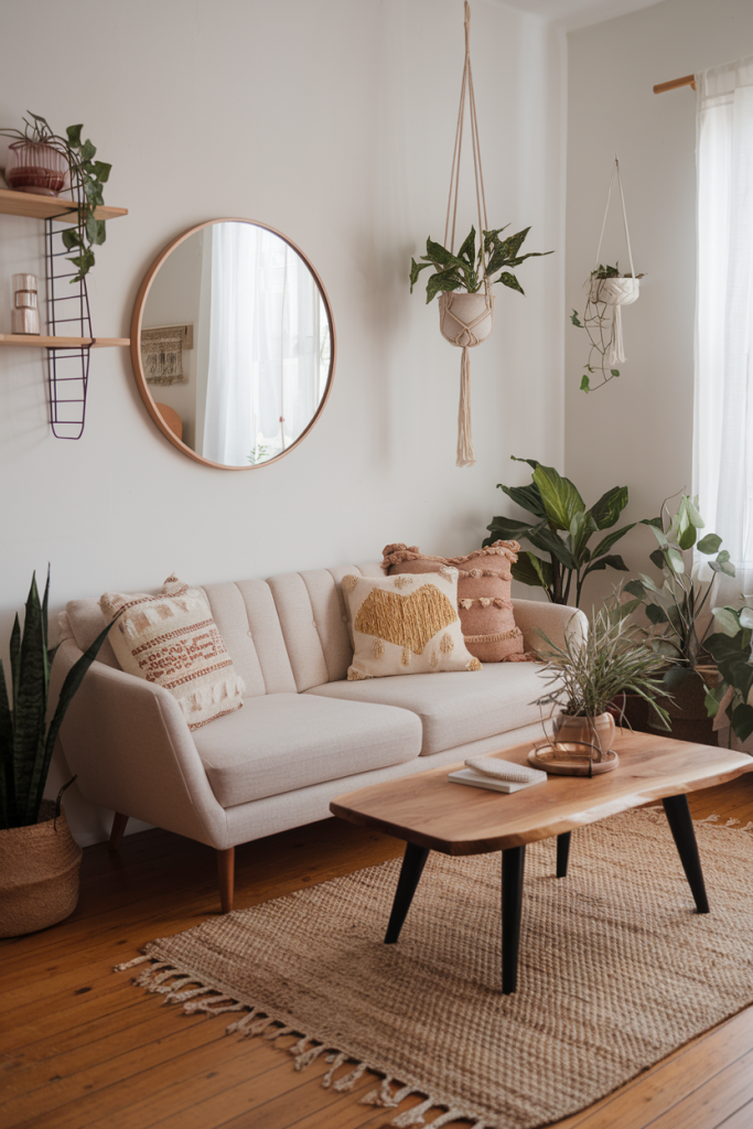 Don’t forget plants as wall decor. Hanging planters or a living wall can bring nature indoors and add to the boho feel.