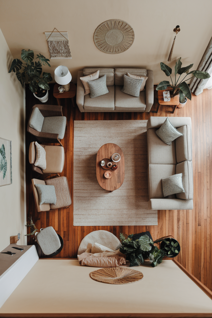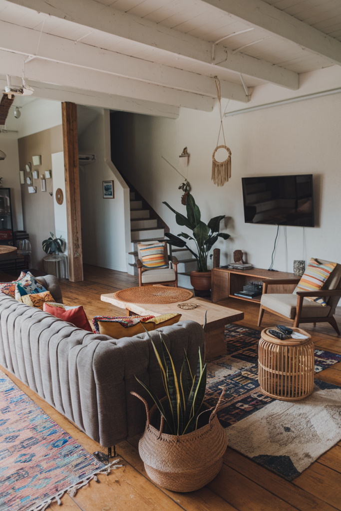 Choose a low-profile sofa in a neutral color as an anchor piece. Add rattan chairs or a bamboo loveseat for boho flair. Pick a wooden TV stand with clean lines.