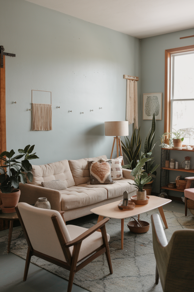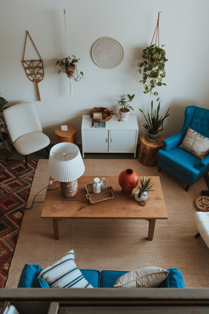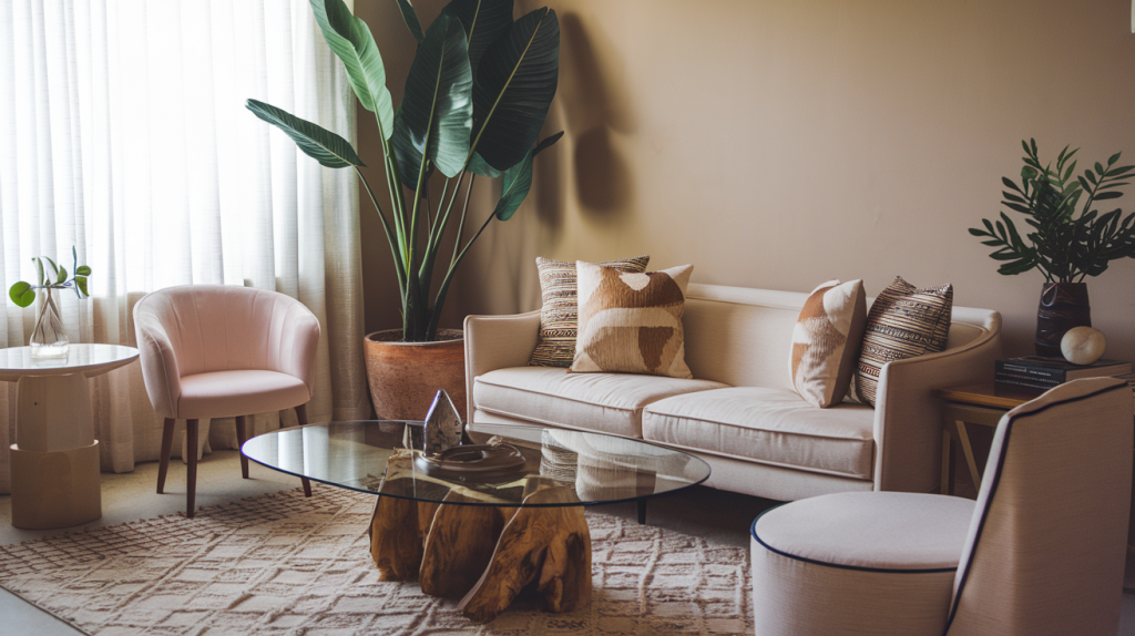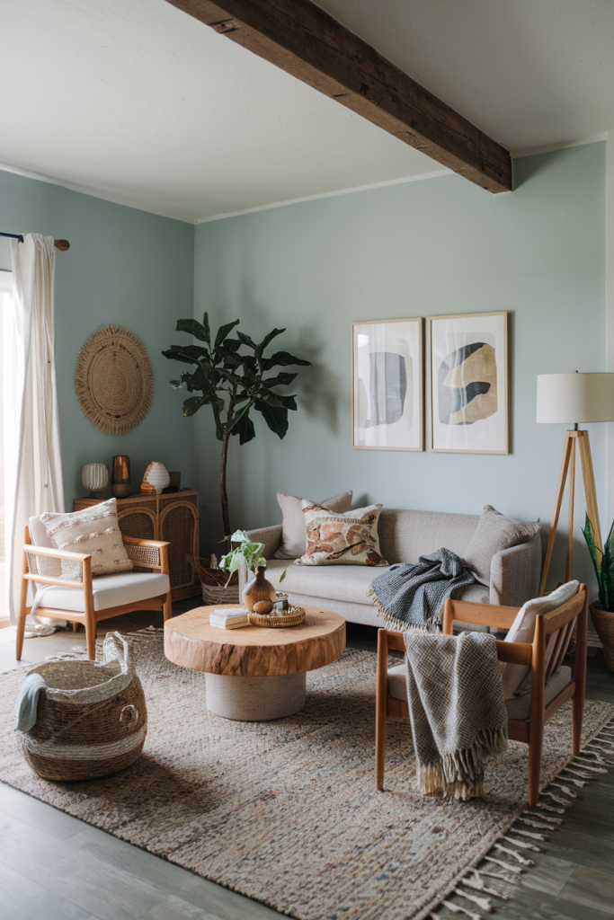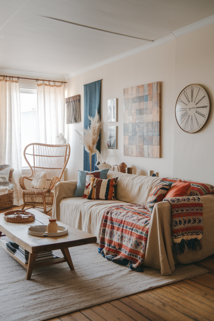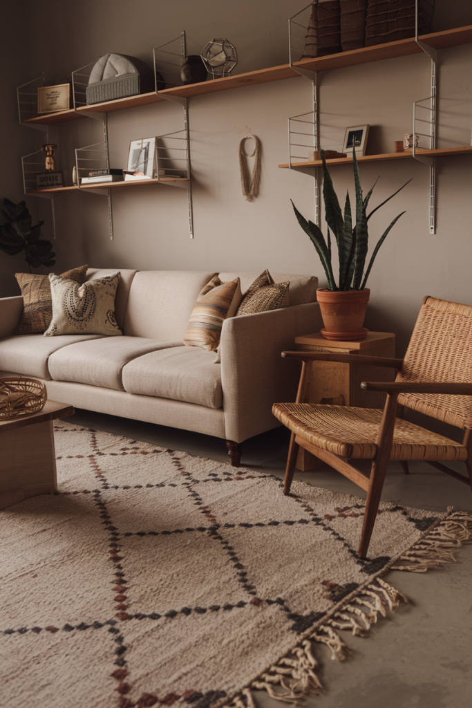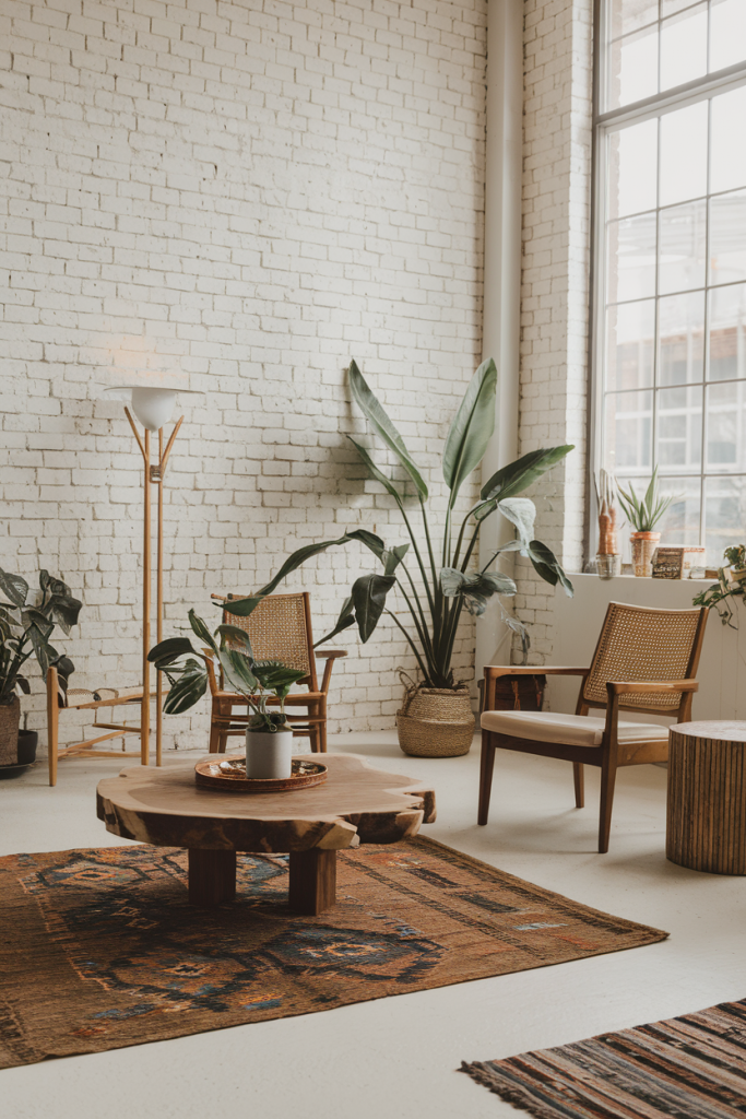 Start with a neutral base of white or light gray walls. Add pops of color with pillows, rugs, and art in warm earth tones. Mix rattan chairs with a sleek sofa for balance.