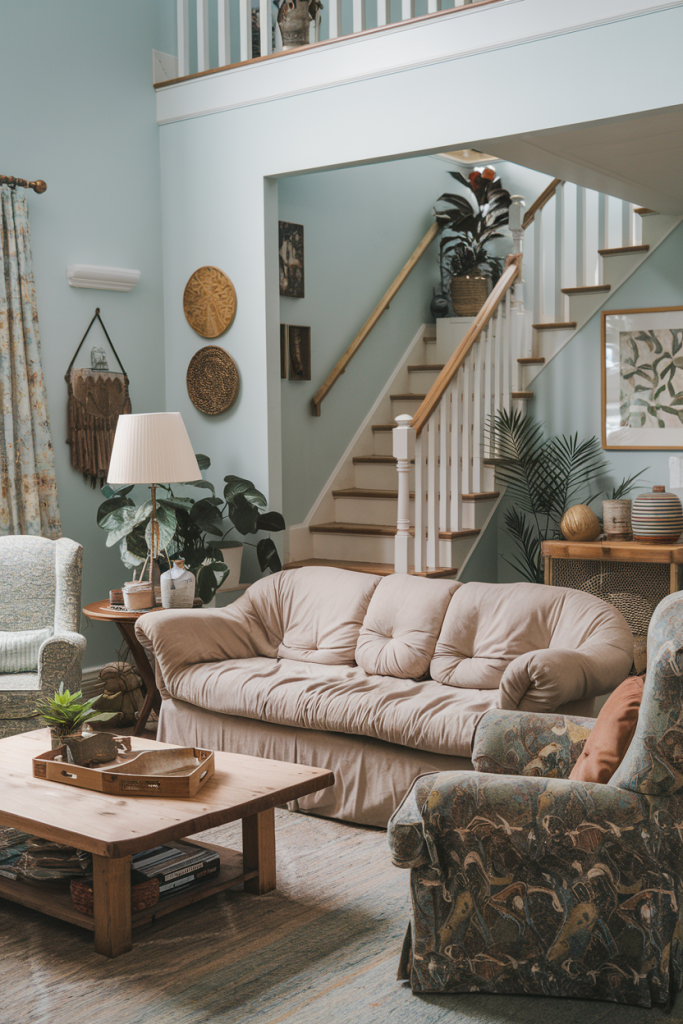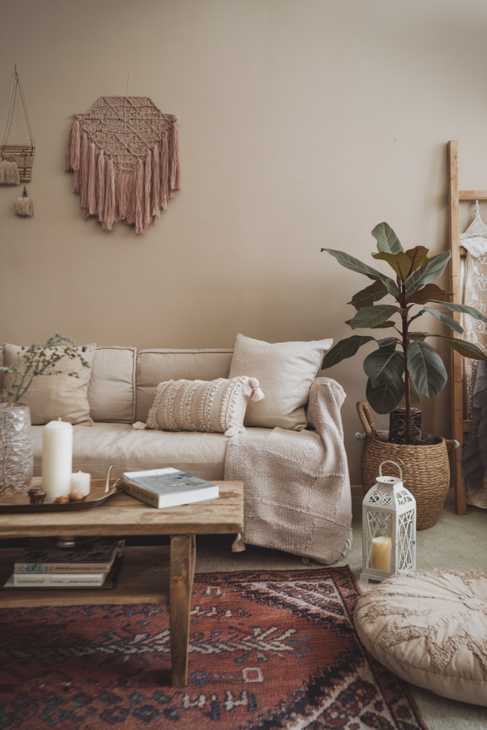 Earthy colors ground a boho space. Think warm browns, soft tans, and muted greens. These shades create a cozy feel and keep bright colors from overwhelming the room.