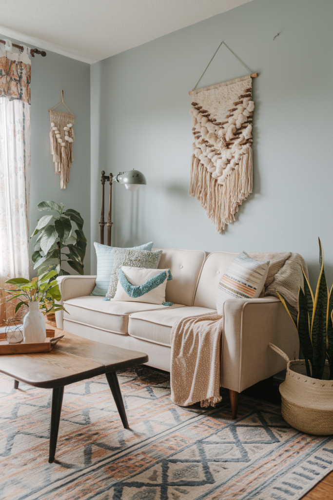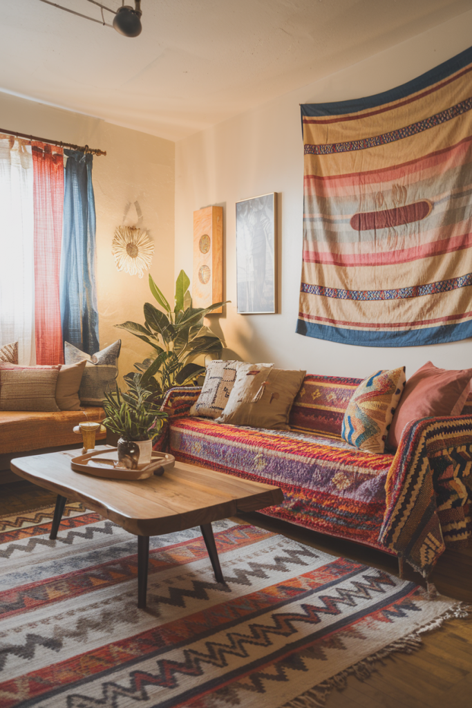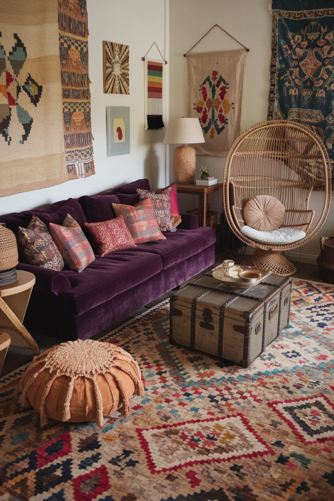 Layering is key in boho rooms. Mix and match rugs, pillows, and throws. Add wall hangings like tapestries or macramé for extra texture.
