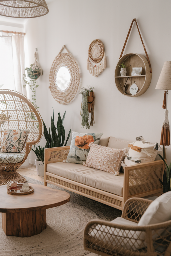 Rattan and wicker furniture are must-haves for a boho living room. They bring a natural, laid-back feel to the space. Look for chairs, sofas, or even hanging egg chairs made from these materials.