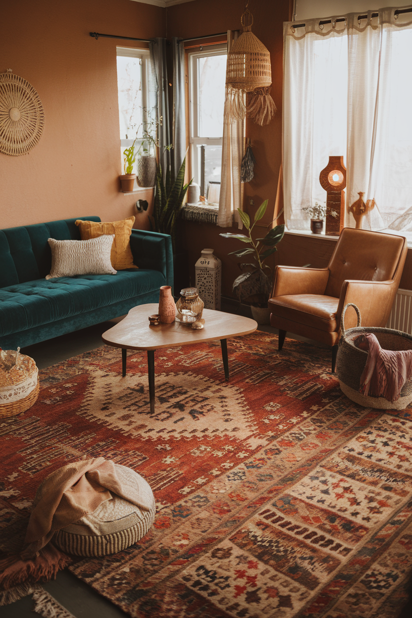 Textiles and rugs bring warmth and personality to a boho living room. They add color, texture, and visual interest through layering and mixing patterns.
