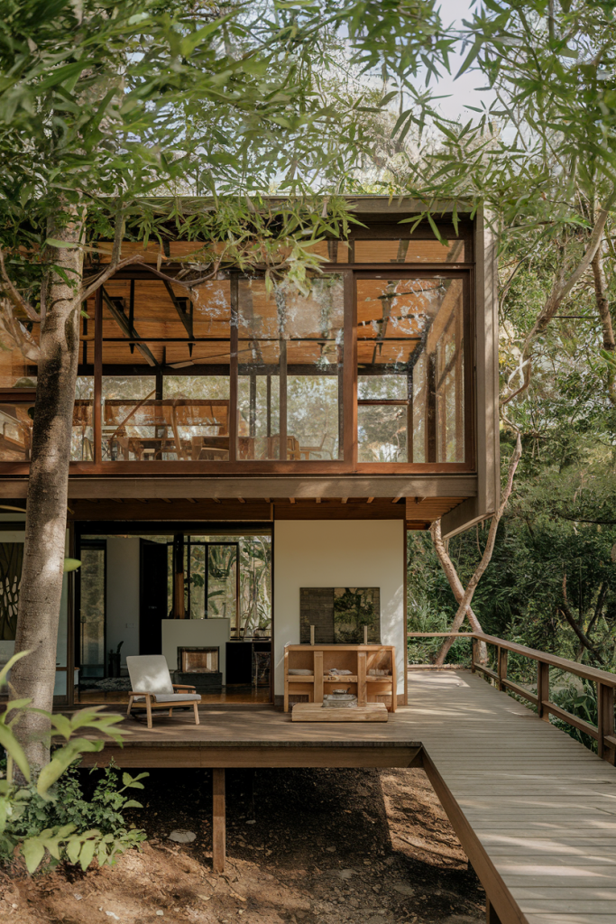 You’ll be enchanted by how mid-century modern homes seamlessly blend with their natural surroundings. Large windows and glass walls create a strong visual connection to the outdoors, making you feel immersed in nature even when inside.