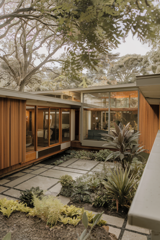 Mid-century modern houses seamlessly combine open floor plans, large windows, and sleek lines to create a timeless aesthetic that’s as relevant today as it was in the 1950s. You’ll love how these homes bring the outdoors in, with expansive glass walls that blur the boundaries between interior and exterior spaces. It’s like having your own private nature retreat right in your living room!